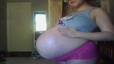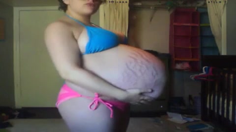 Молодая будущая мама раздевается и показывает на камеру свой нереально большой животик
